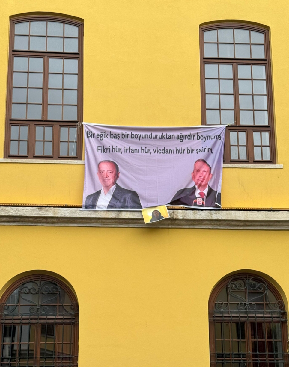 Ama bu kez bir ayrıntı vardı, Galatasaray’ı ve Galatasaraylılar’ı gerçekten sevenler ana binanın ön bahçeye bakan cephesine Remzi ve Fatih Altaylı‘nın fotoğraflarının bulunduğu bir pankart astılar. Altına da MESEM cinayetlerini protesto ederken gözaltına alınıp tutuklanan 20 yaşındaki Elif Akın‘ın fotoğrafını iliştirmişler. Ne yazık ki merhametsizlerin hızına yetişmek bazen zor oluyor. Elif kardeşimizin tutukluğu pankartı hazırlayanlara da sürpriz olmuş.
